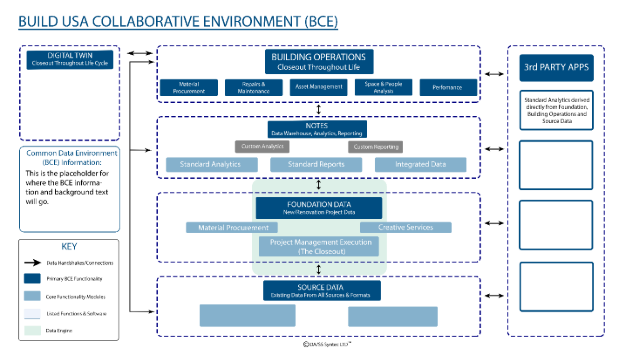 The BuildUSA BCE is a branded solution designed to deliver this integrated workflow. It connects all project data modules — foundation data, source data, building operations, digital twins, and third-party applications — into a cohesive, data-driven ecosystem.